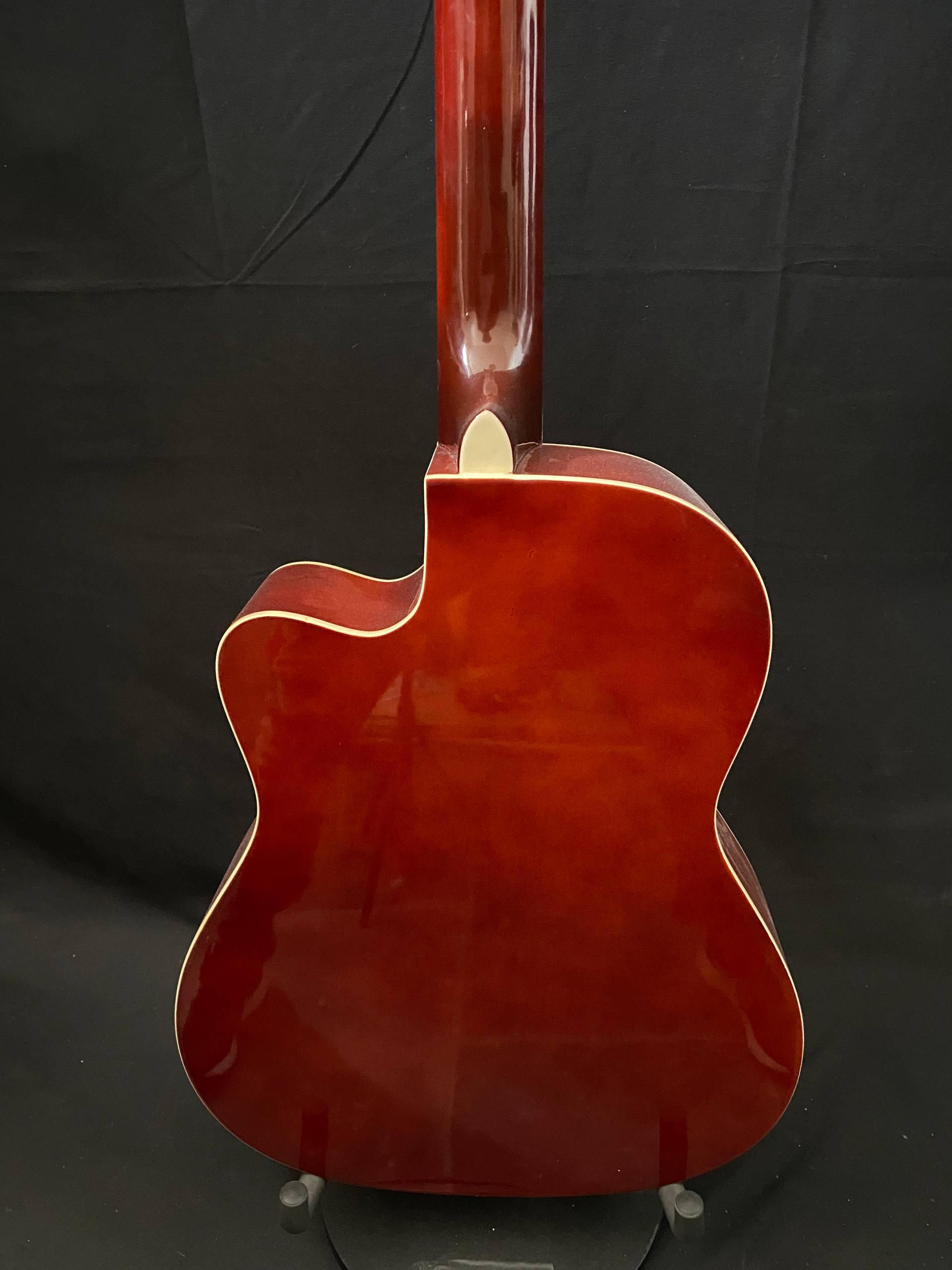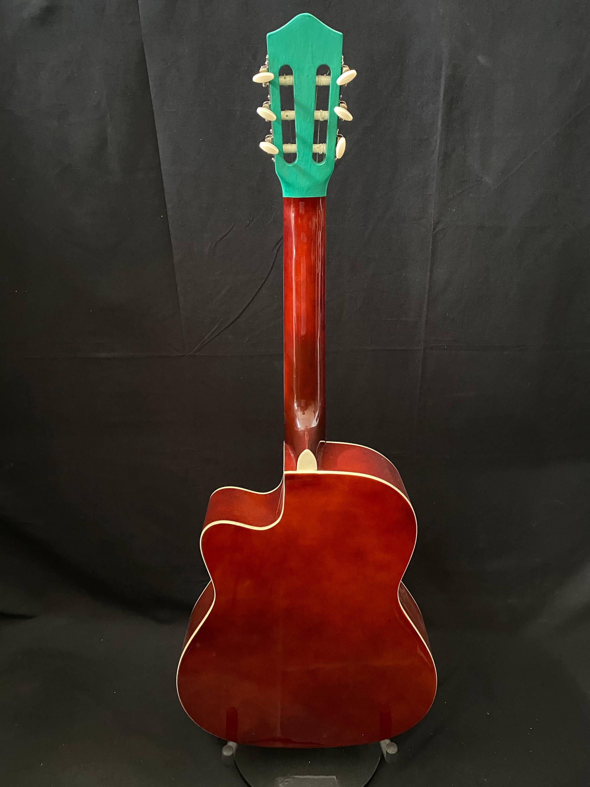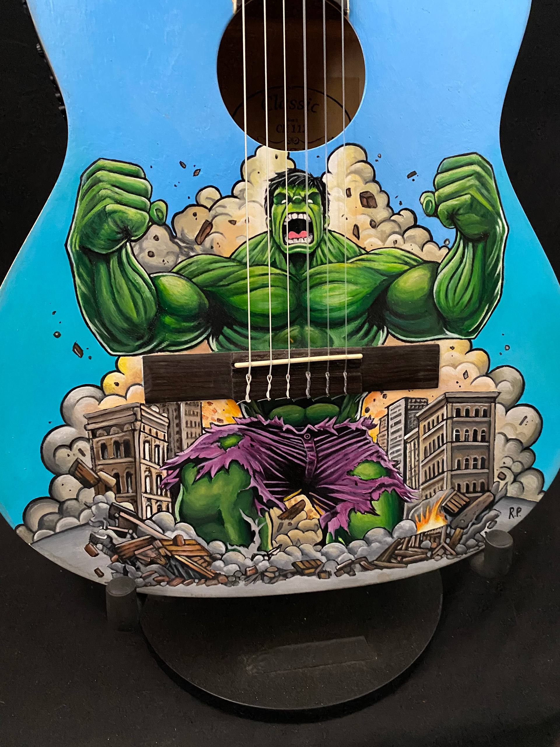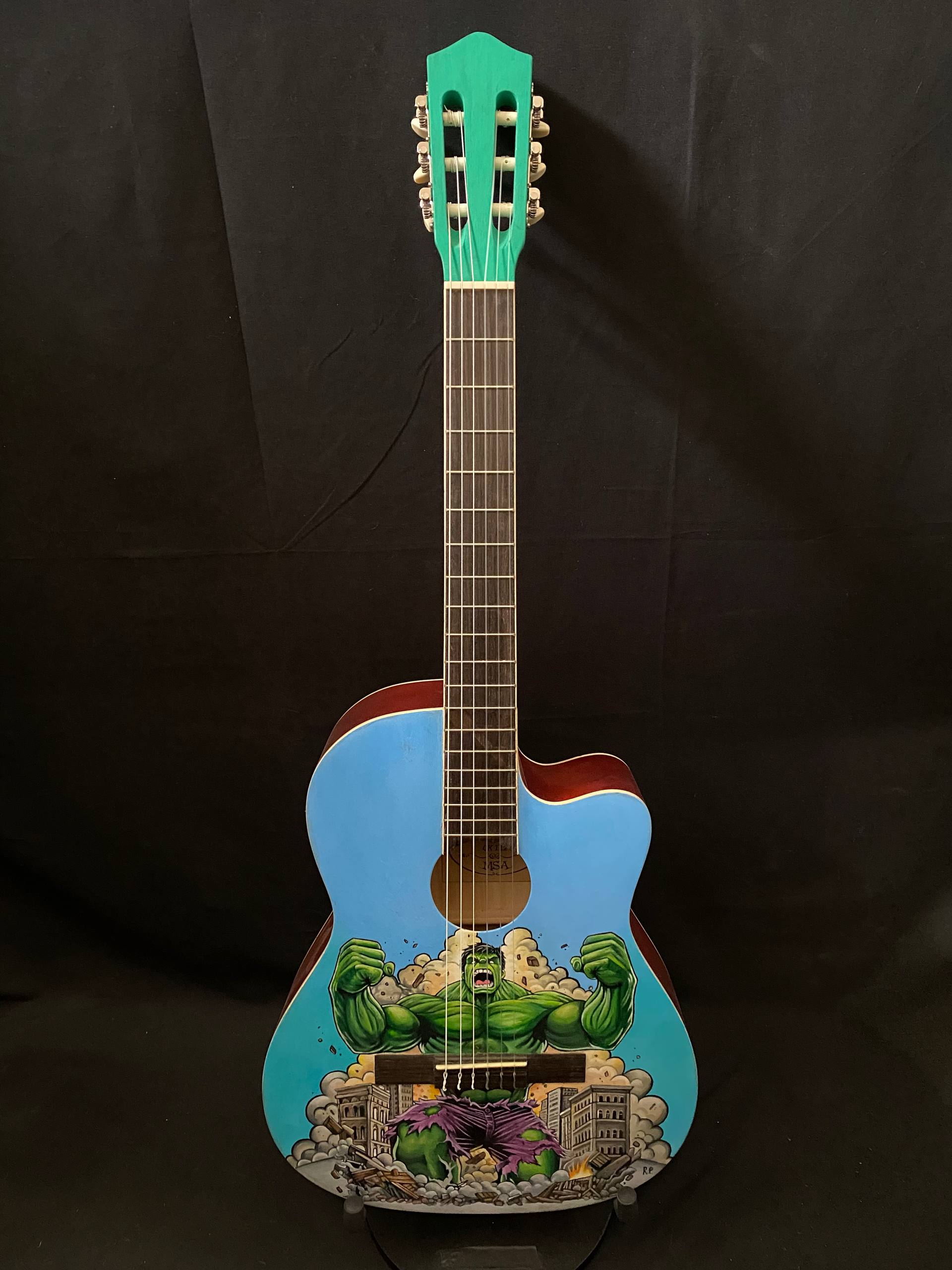 Unique amplified classical guitar! On its elegant body stands a nice hand-drawn Hulk illustration by artist Roberta Perrotta, who turned this instrument into a true work of art. Every detail has been crafted with passion and creativity, making this guitar not just a musical instrument